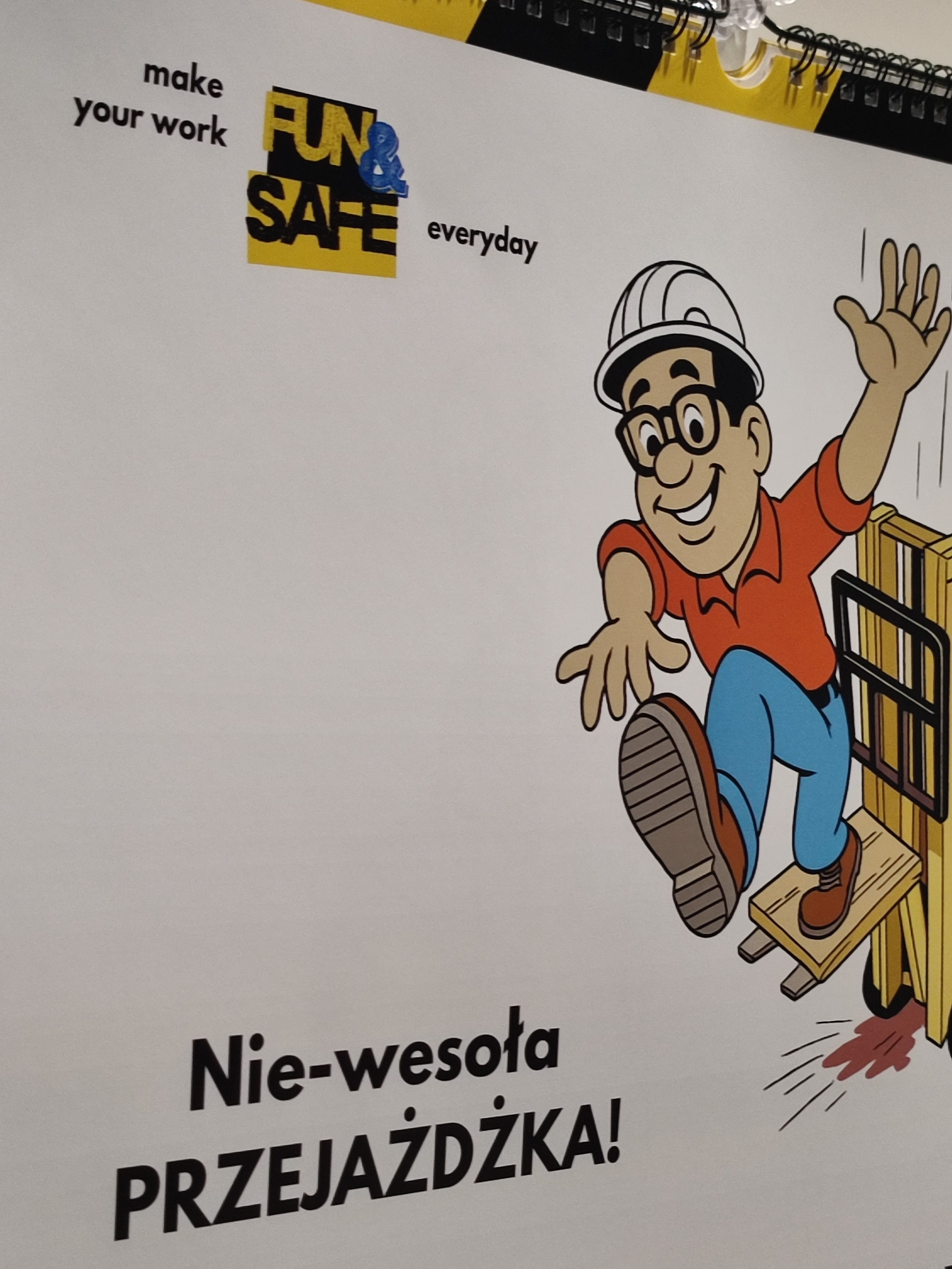 Tym, co wyróżnia kalendarz, jest jego komiksowa forma. Zamiast tradycyjnych, tekstowych instrukcji postawiliśmy na rysunkowe scenki sytuacyjne, które w przystępny i często humorystyczny sposób pokazują zarówno niewłaściwe zachowania, jak i prawidłowe postawy. Taka forma przyciąga uwagę, ułatwia zapamiętywanie i sprawia, że przekaz BHP staje się bardziej angażujący.