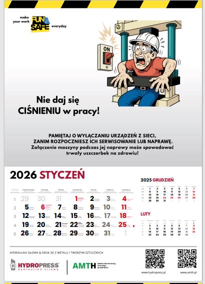Kalendarz przekazaliśmy w grudniu 2025 r. pracownikom Hydropress Hydraulika Siłowa oraz naszym partnerom biznesowym. Wierzymy, że taka forma dzielenia się wiedzą to realna wartość dodana ze współpracy z nami i ważny element odpowiedzialnego podejścia do pracy. Bo bezpieczeństwo najlepiej działa wtedy, gdy jest widoczne przez cały rok!